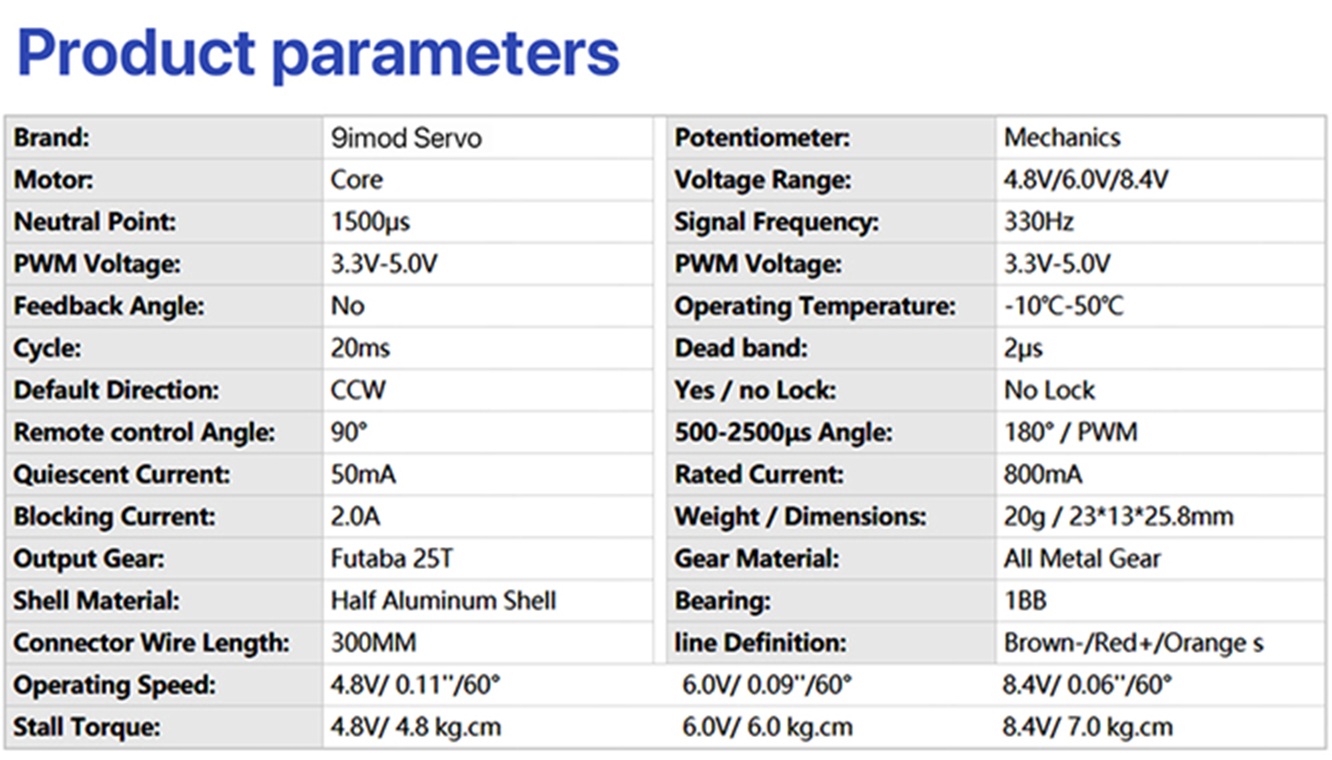 Stall Torque: 4.8V/ 4.8 kg.cm; 6.0V/ 6.0 kg.cm; 8.4V/ 7.0 kg.cm